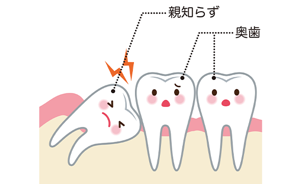 親知らずが横向きに生えて隣の歯に面してむし歯になるケースは珍しくありません。例えば、歯がわずかに露出している場合、食べカスが溜まりやすくなり、奥歯ゆえに歯ブラシが届きにくくなります。その結果、歯周病やむし歯にかかりやすくなります。こうした場合は、早めに親知らずを抜歯することが望ましいです。また、親知らずが奥歯を押し出し、歯並びが乱れるケースもあります。歯並びの乱れやむし歯のリスクがある場合は、親知らずを抜くことをおすすめします。
