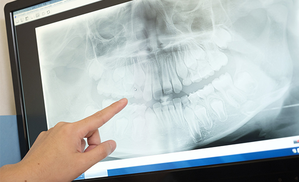 抜歯前に歯科用CT撮影を行うことで、顎の骨の状態や歯の根の数や形状、神経の位置などを正確に把握できます。負担の少ない抜歯を行うために必要な情報を事前に把握し、安全かつ確実な親知らずの抜歯の立案に役立てます。
